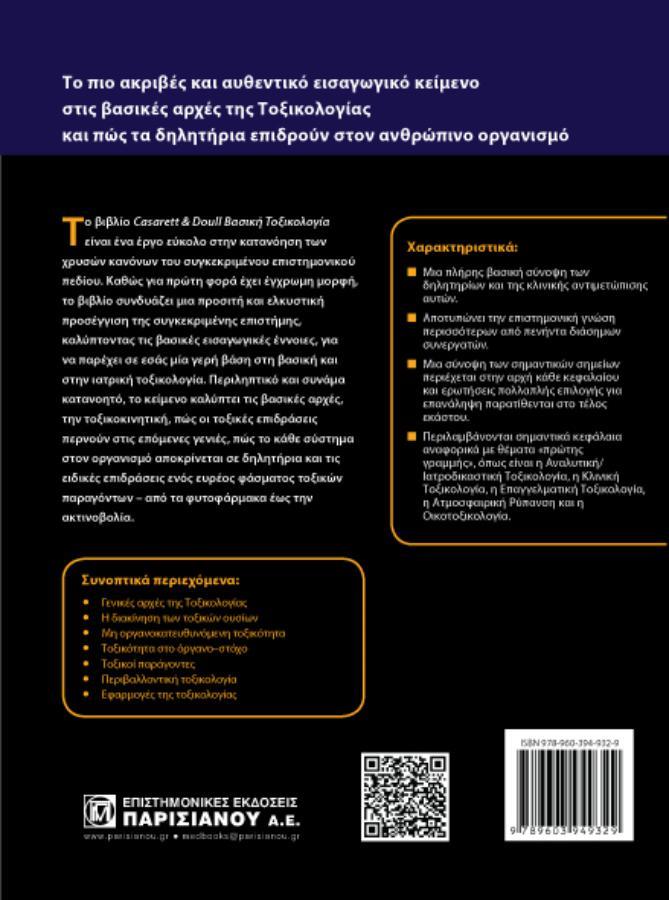 Περιληπτικό και συνάμα κατανοητό, το κείμενο καλύπτει τις βασικές αρχές, την τοξικοκινητική, πώς οι τοξικές επιδράσεις περνούν στις επόμενες γενιές, πώς το κάθε σύστημα στον οργανισμό αποκρίνεται σε δηλητήρια και τις ειδικές επιδράσεις ενός ευρέος φάσματος τοξικών παραγόντων – από τα φυτοφάρμακα έως την ακτινοβολία.