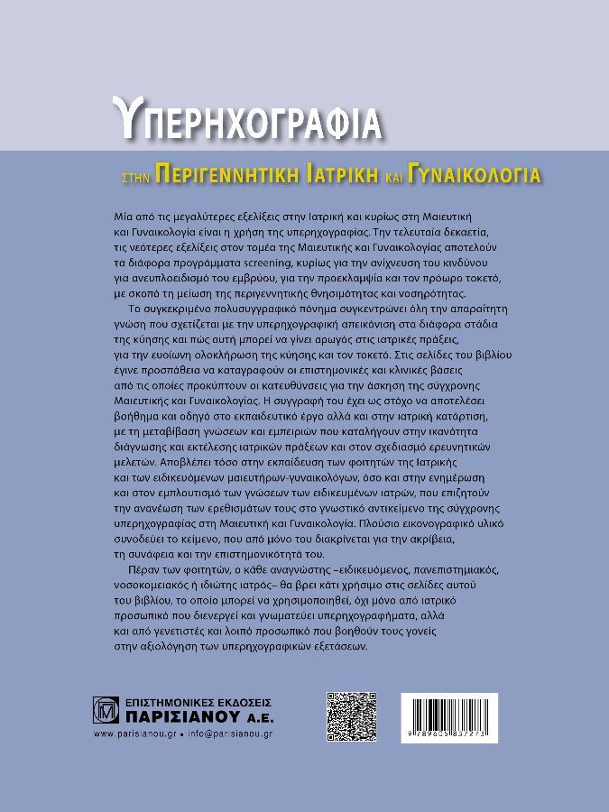 Το συγκεκριμένο πολυσυγγραφικό πόνημα συγκεντρώνει όλη την απαραίτητη γνώση που σχετίζεται με την υπερηχογραφική απεικόνιση στα διάφορα στάδια της κύησης και πώς αυτή μπορεί να γίνει αρωγός στις ιατρικές πράξεις, για την ευοίωνη ολοκλήρωση της κύησης και τον τοκετό. Στις σελίδες του βιβλίου έγινε προσπάθεια να καταγραφούν οι επιστημονικές και κλινικές βάσεις από τις οποίες προκύπτουν οι κατευθύνσεις για την άσκηση της σύγχρονης Μαιευτικής και Γυναικολογίας. Η συγγραφή του έχει ως στόχο να αποτελέσει βοήθημα και οδηγό στο εκπαιδευτικό έργο αλλά και στην ιατρική κατάρτιση, με τη μεταβίβαση γνώσεων και εμπειριών που καταλήγουν στην ικανότητα διάγνωσης και εκτέλεσης ιατρικών πράξεων και στον σχεδιασμό ερευνητικών μελετών. Αποβλέπει τόσο στην εκπαίδευση των φοιτητών της Ιατρικής και των ειδικευόμενων μαιευτήρων-γυναικολόγων, όσο και στην ενημέρωση και στον εμπλουτισμό των γνώσεων των ειδικευμένων ιατρών, που επιζητούν την ανανέωση των ερεθισμάτων τους στο γνωστικό αντικείμενο της σύγχρονης υπερηχογραφίας στη Μαιευτική και Γυναικολογία. Πλούσιο εικονογραφικό υλικό συνοδεύει το κείμενο, που από μόνο του διακρίνεται για την ακρίβεια, τη συνάφεια και την επιστημονικότητά του.