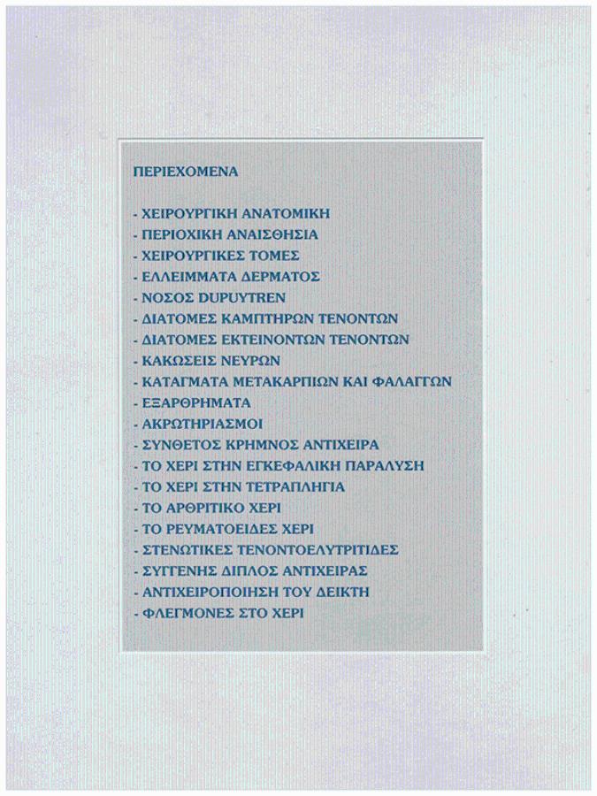 Στο βιβλίο αυτό περιγράφεται η τεχνική χειρουργικών επεμβάσεων που γίνονται σε παθολογικές και τραυματικές καταστάσεις στο χέρι. Από τη βιβλιογραφία επιλέχθηκαν οι τεχνικές με την ευρύτερη παραδοχή και εκείνες στις οποίες ο συγγραφέας έχει προσωπική εμπειρία.
